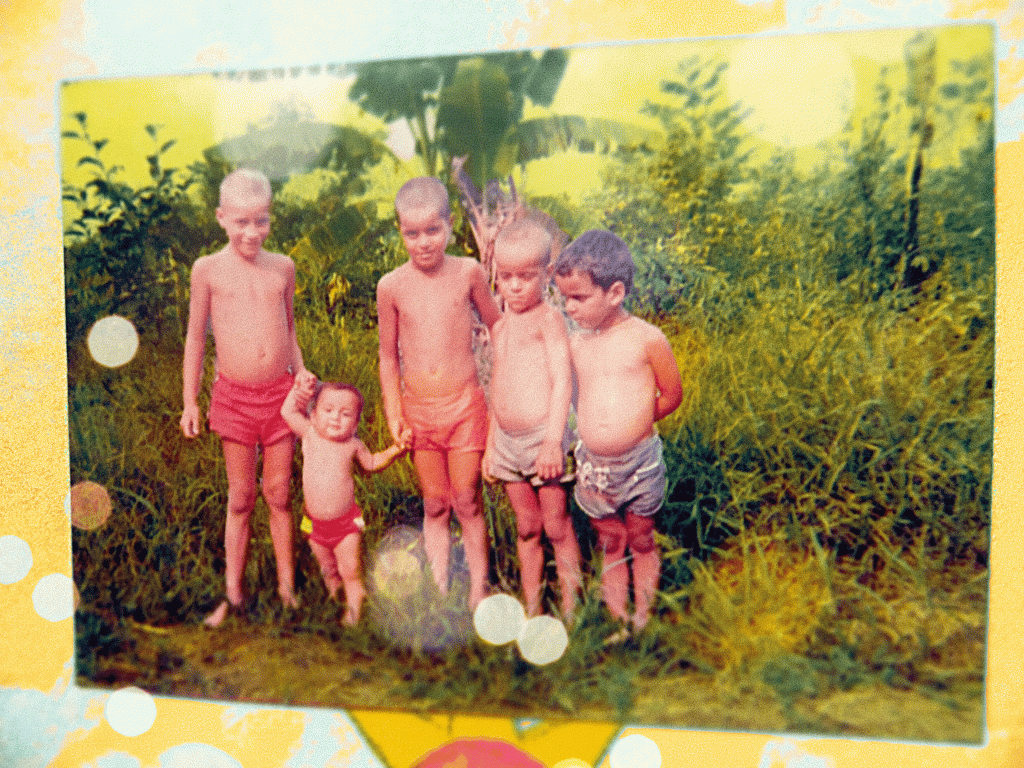 Eu e meus irmãos estávamos com as nossas cabeças raspadas por causa de piolho ou seria apenas para facilitar o cuidado. Nós rapazinhos, já bem grandinhos, quase homens feitos ficamos ali parados, descalços, de shortinhos coloridos, fazendo umas poses sem-graças em frente da câmera.